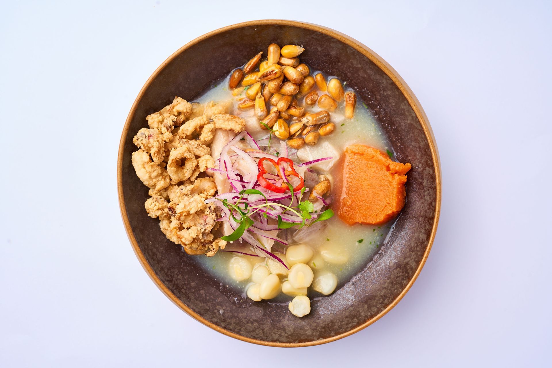 Corvina, classic tiger's milk, corn, sweet potato and toasted corn.